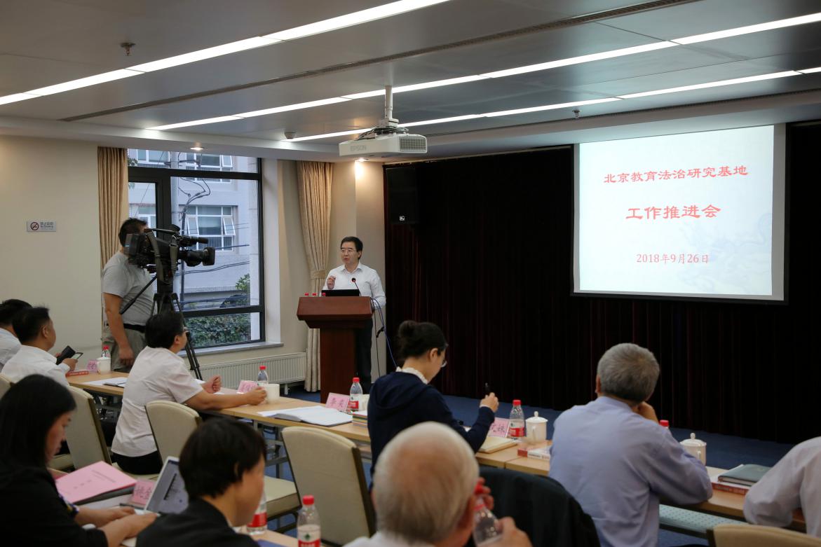 2018年9月26日下午,北京教育法治研究基地工作推进会在北京市教育委员会213会议室举行。北京市教育委员会、北京市人大常委会法制办、市人大常委会教科文卫体办、市人民政府法制办的有关领导,北京师范大学、中国人民大学、中国政法大学、北京外国语大学、北京教育学院、北京教育科学研究院、首都师范大学、首都经济贸易大学校主管领导及基地负责人、联络人也参加了本次会议。