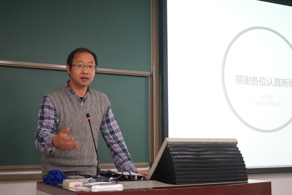 朱明哲老师从法学研究的两种范式——法教义学和社科法学入手展开主题讲座。通过“教义阐释与现象反思”、“规则与原则”、“法律科学与法社会学”三个方面,向同学们展示了论文写作中可以采取的两种不同的选题思路和讨论路径。同时朱明哲老师用生动形象的例子和诙谐幽默的语言深入浅出地向同学们介绍了“法律体系”这一概念的具体特征,让同学们受益匪浅。