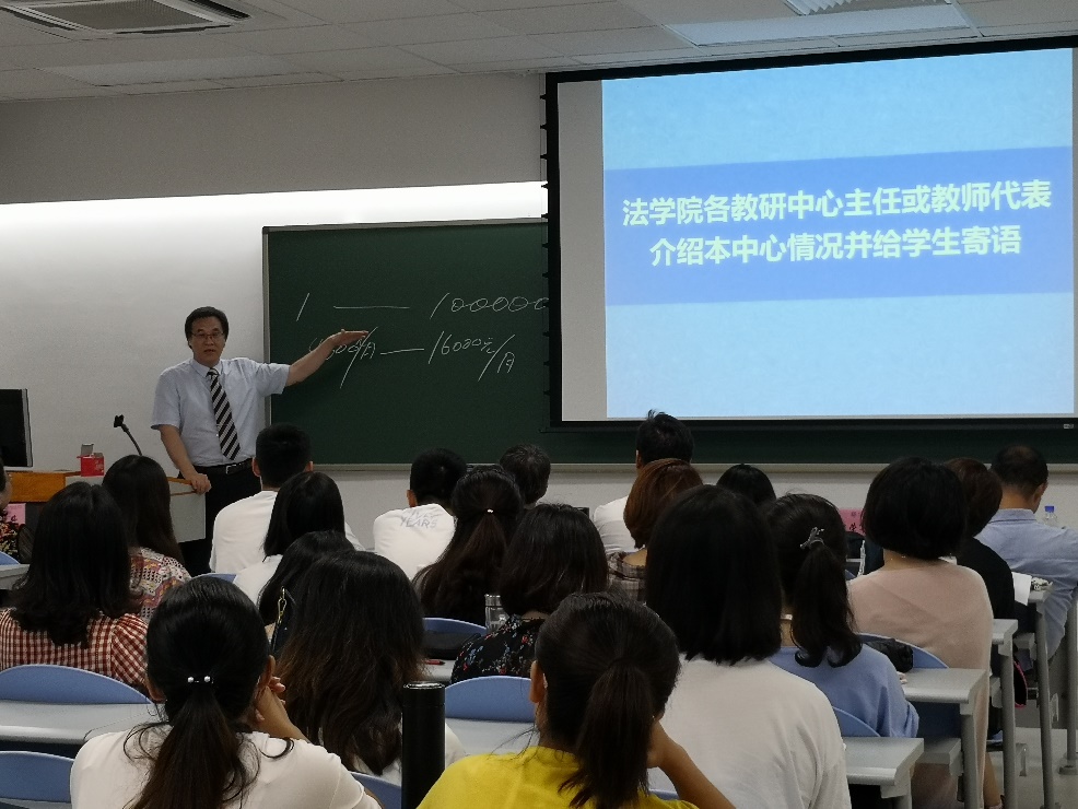 诉讼法学教研中心刘荣军教授上台发言,他轻松幽默地向同学们说起了诉讼法的课程特点和中心师资情况。刘荣军教授向同学们表达了他对于对研究生的期望,并结合自己的经验与感受,向同学们提出了如何平衡生活和学习关系的建议。